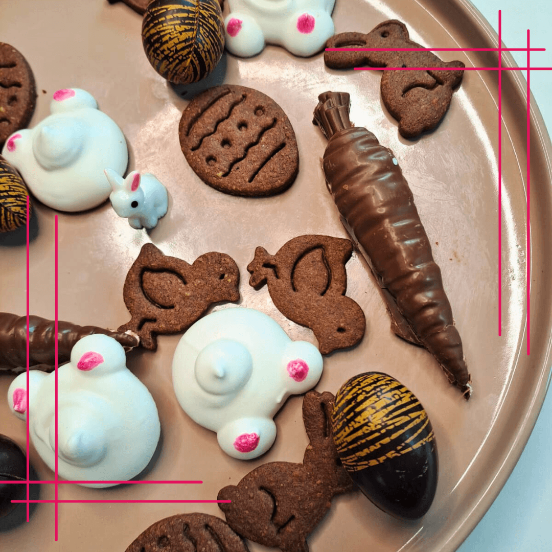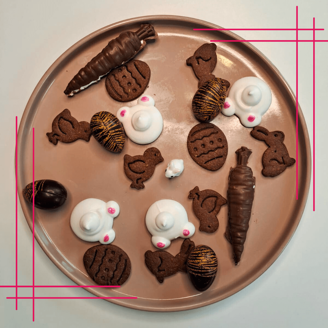 sablés au chocolat, guimauves, meringues, œufs en chocolat, 1 lapin non comestible.