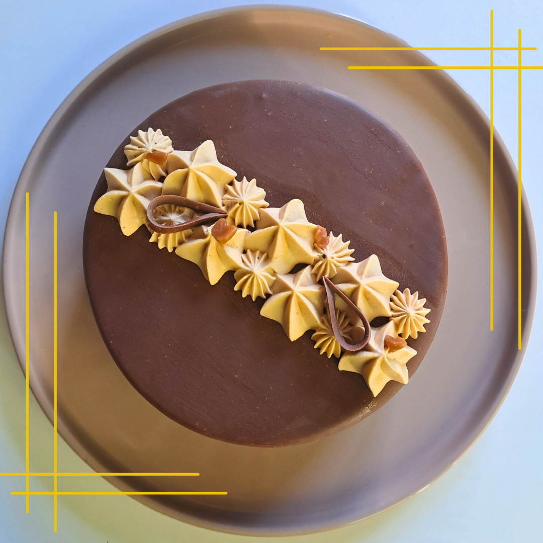 L’entremet commence par une base de biscuit brownie au chocolat, offrant une première note gourmande qui évoque des souvenirs de douceurs enfantines. Par-dessus, une mousse aérienne au chocolat au lait vient envelopper votre palais dans une onctuosité voluptueuse, libérant des arômes subtils et riches à la fois.